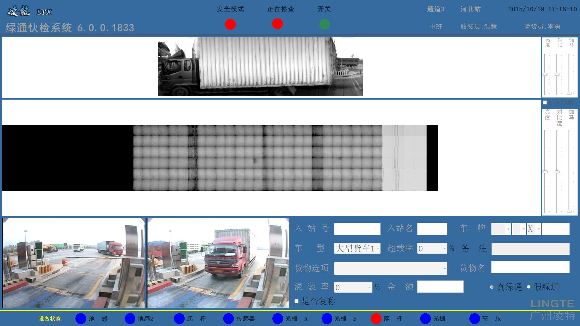 京石路此次安裝的X光綠通檢測設(shè)備,區(qū)別于常規(guī)的探頭檢測和放射線檢測裝置。它由一個Ⅲ類射線裝置、一個探測列陣裝置組成。該檢測設(shè)備利用Ⅲ類X光射線裝置發(fā)出的扇形射線透過車輛裝載的貨物,射線被另一側(cè)的探測器接收,利用不同貨物對X光射線吸收程度不同的原理,生成不同輪廓和形態(tài)的效果圖。工作人員可根據(jù)效果圖來判斷車輛是否屬于綠通車,從而達(dá)到快速準(zhǔn)確檢驗(yàn)的目的。