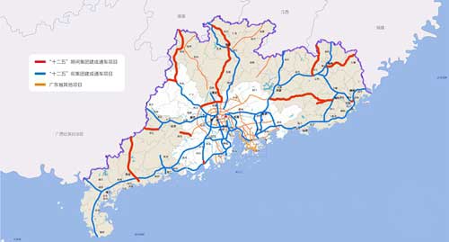 根據(jù)《廣東省綜合交通運輸體系“十二五”規(guī)劃》,將加快國家高速公路粵境段、高速公路出省通道和珠江口東西兩岸跨江通道建設(shè),構(gòu)建布局合理、通達(dá)便利和具有較高服務(wù)水平的高速公路網(wǎng)絡(luò)。省委、省政府確立高速公路建設(shè)2大目標(biāo):“十二五”期間,全省將實現(xiàn)縣縣通高速公路,全省高速公路通車?yán)锍踢_(dá)6500公里。